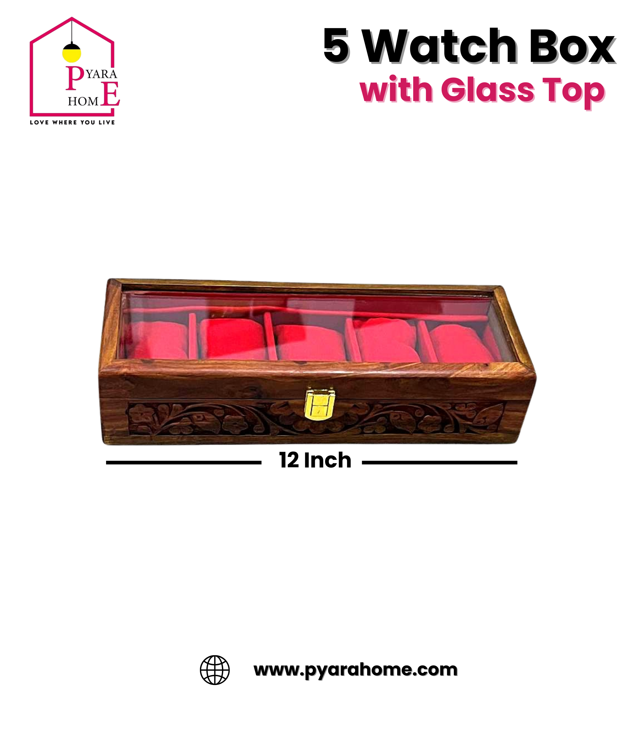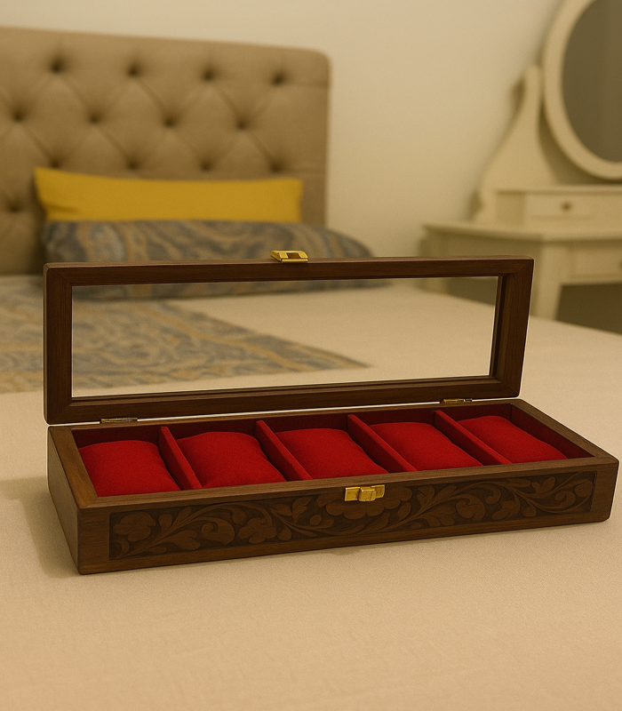 Showcase your watches in style with the 5 Watches Box Glass Top from Pyara Home. Perfect for collectors and everyday users, this elegant storage case is crafted to protect, organize, and beautifully display up to five watches.