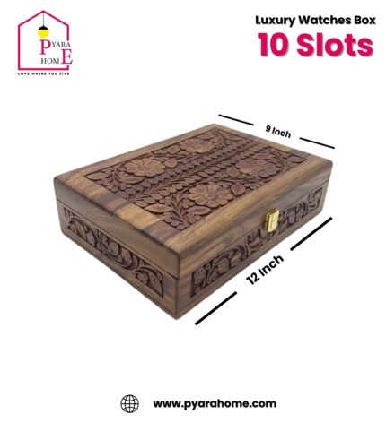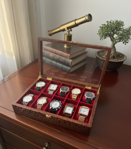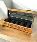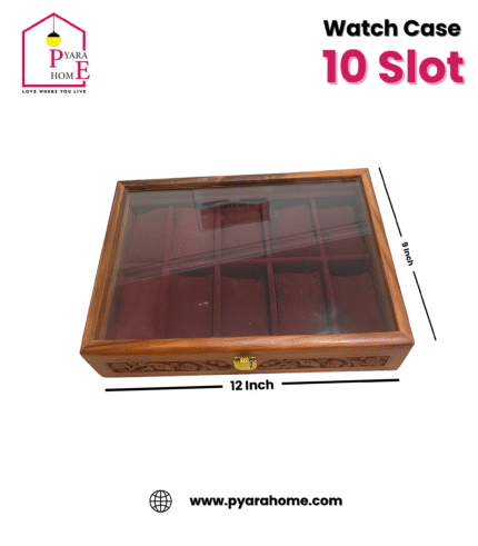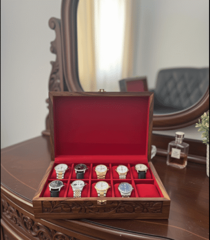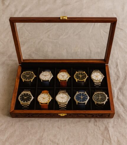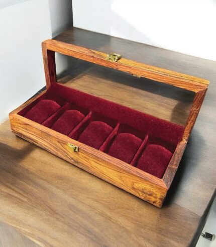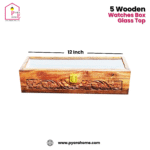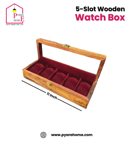 Keep your treasured timepieces safe and stylishly displayed with our Elegant 5-Slot Wooden Watch Box. Crafted from premium wood and finished with a smooth polish, this box features a clear glass top that lets you admire your collection without opening the lid. The soft, cushioned interiors gently cradle each watch, protecting them from scratches and dust. Perfect for personal use or as a sophisticated gift for watch enthusiasts.